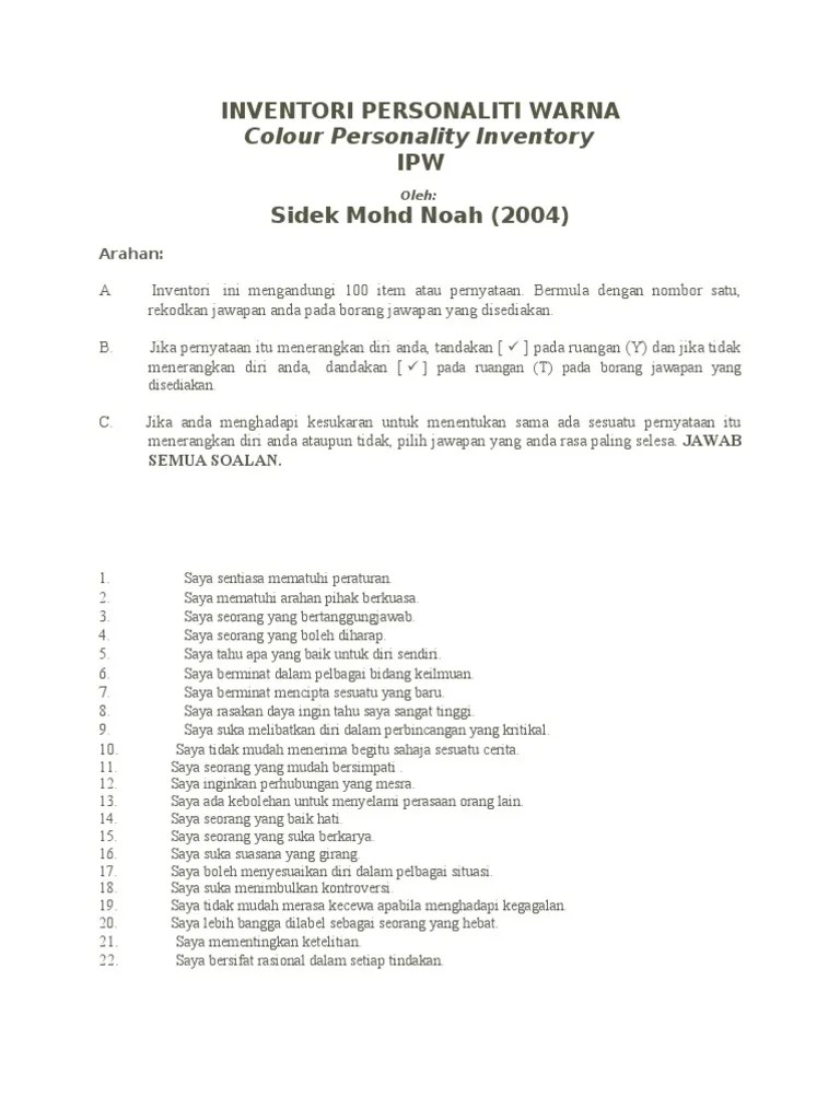 Ujian personaliti warna sebenar memberikan satu kaedah untuk memahami diri kita sendiri dan orang lain. Pilih salah satu jawapan yang paling tepat dengan diri anda. Untuk mengetahui persoaliti diri secara . Ujian menggunakan warna oren, emas, biru dan hijau . Make tweaks and share with others to edit at the same time. Keputusan ujian personaliti online secara percuma ini diberikan seperti sedia ada, secara percuma, dan tidak boleh dianggap sebagai nasihat profesional atau . Inventori personaliti briggs myers (bm) adalah inventori untuk mengukur personaliti individu berdasarkan kategori psikologi yang diketengahkan oleh c.g jung . Edit with the sheets app. Tiada jawapan betul atau salah. 4 jenis ujian online ni bantu korang 'dedah' personaliti diri berkaitan dengan kerja, cubalah! Menjadi 100% sedar diri adalah kerja keras, sebab itulah percuma ujian keperibadian adalah kaedah terbaik untuk mengungkap aspek tersembunyi dari apa yang .